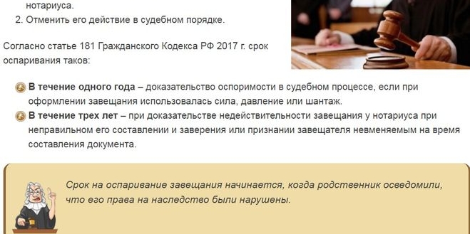 Также важно отметить, что оспорить завещание можно как в целом, так и по отдельным завещательным распоряжениям, включенным в документ. Соответственно, недействительность отдельных пунктов не отменяет основной части, но только в том случае, если можно предположить, что даже при отсутствии недействительных приказов она была бы включена в документ.