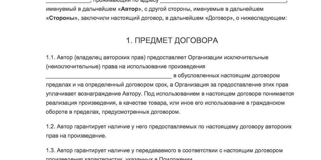 Обратите внимание, что если договор содержит отказ от авторских прав, договор в силу ст. 1265 ГК РФ, ничтожно. Монополия на результат интеллектуальной деятельности или на средство индивидуализации переходит к приобретателю в момент заключения сделки, если иное не предусмотрено соглашением сторон.